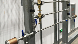 Der Stickstoff wird vom Leitungsnetz mit einem Bauer Kompressor (Verticus 5) auf Hochdruck in Speicherflaschen verdichtet. Über eine Hochdruck-Reduzierstation kann dann der Stickstoff im gewünschten Druckbereich dem Prozess zugeführt werden.